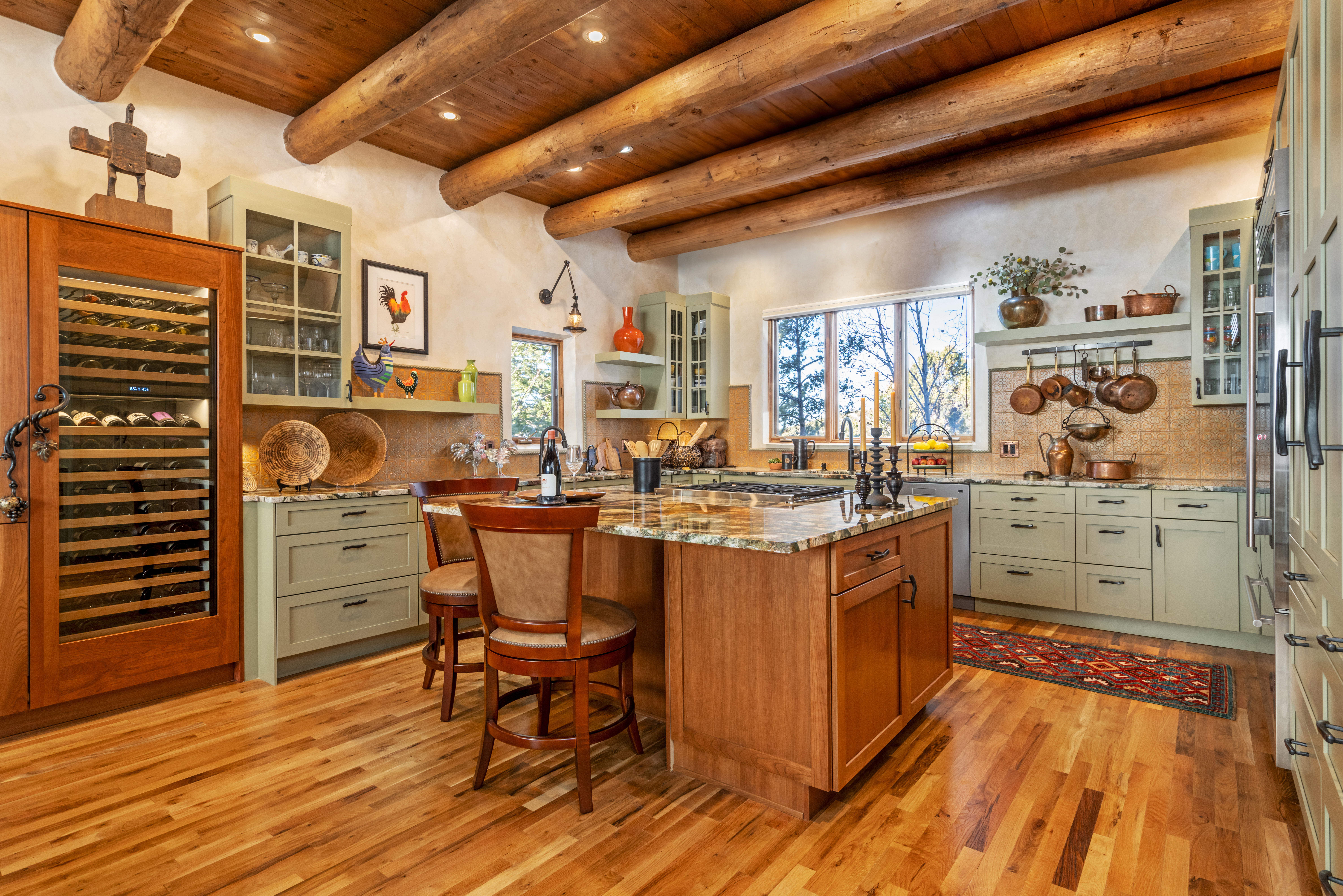 De Leon infused the kitchen with color and local character by selecting olive green cabinets, Desert Canyon granite countertops with striking veins of green and gold, and a bold, earthy-toned backsplash. The result was a perfect blend of Southwest charm and contemporary functionality.
