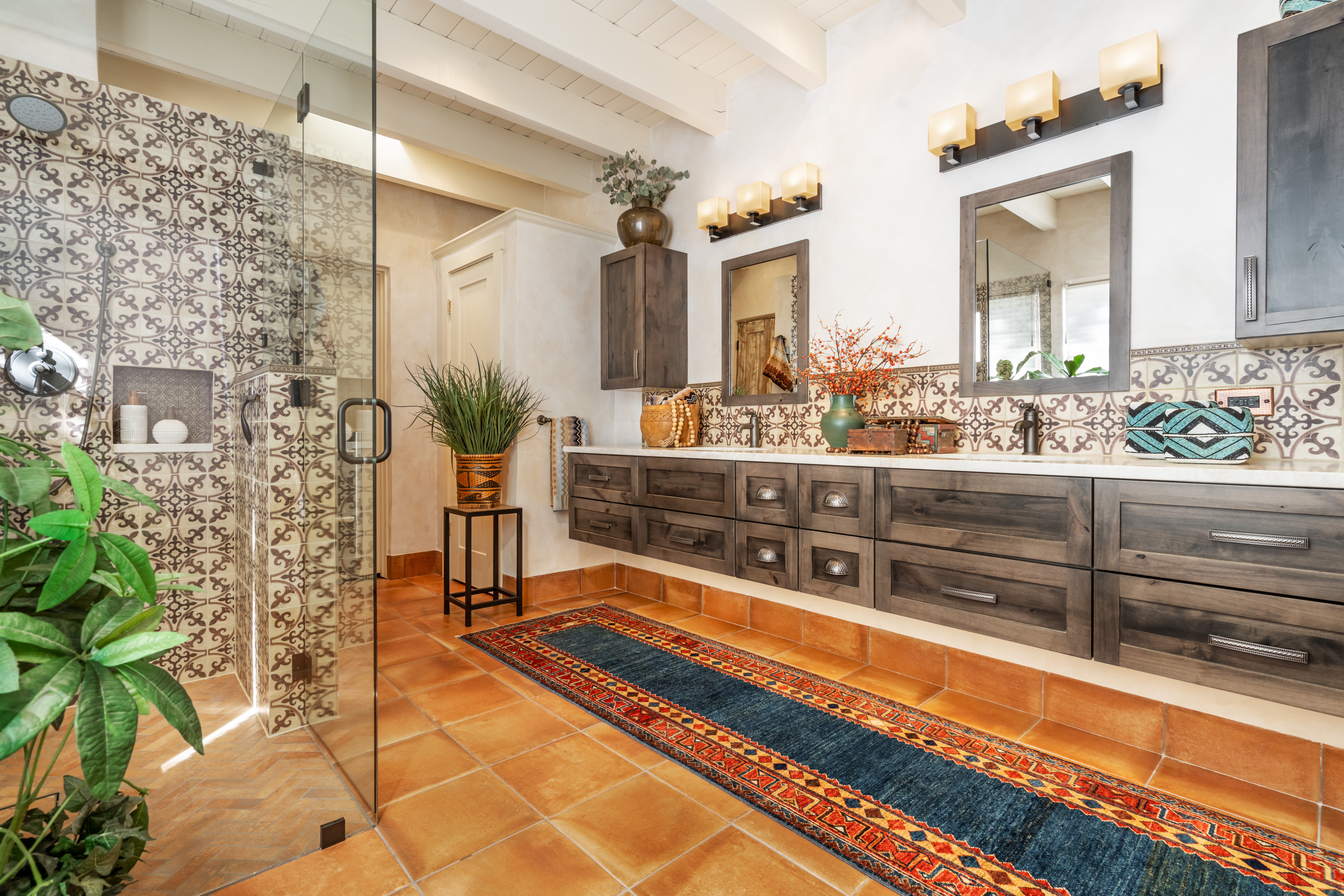When the owners of this residence relocated from California, they wanted to transform the primary bath and kitchen to reflect the local Santa Fe style. With their white-on-white color schemes, these spaces had an early 2000s aesthetic that lacked the warmth and vibrancy of the region. To bring in color, a New Mexican vibe, and modern accents, they enlisted Heceli De Leon of Heceli Kitchens and Baths. De Leon collaborated with Edy Keeler—whose firm, Edy Keeler Interiors, she had recently acquired—throughout the remodel.