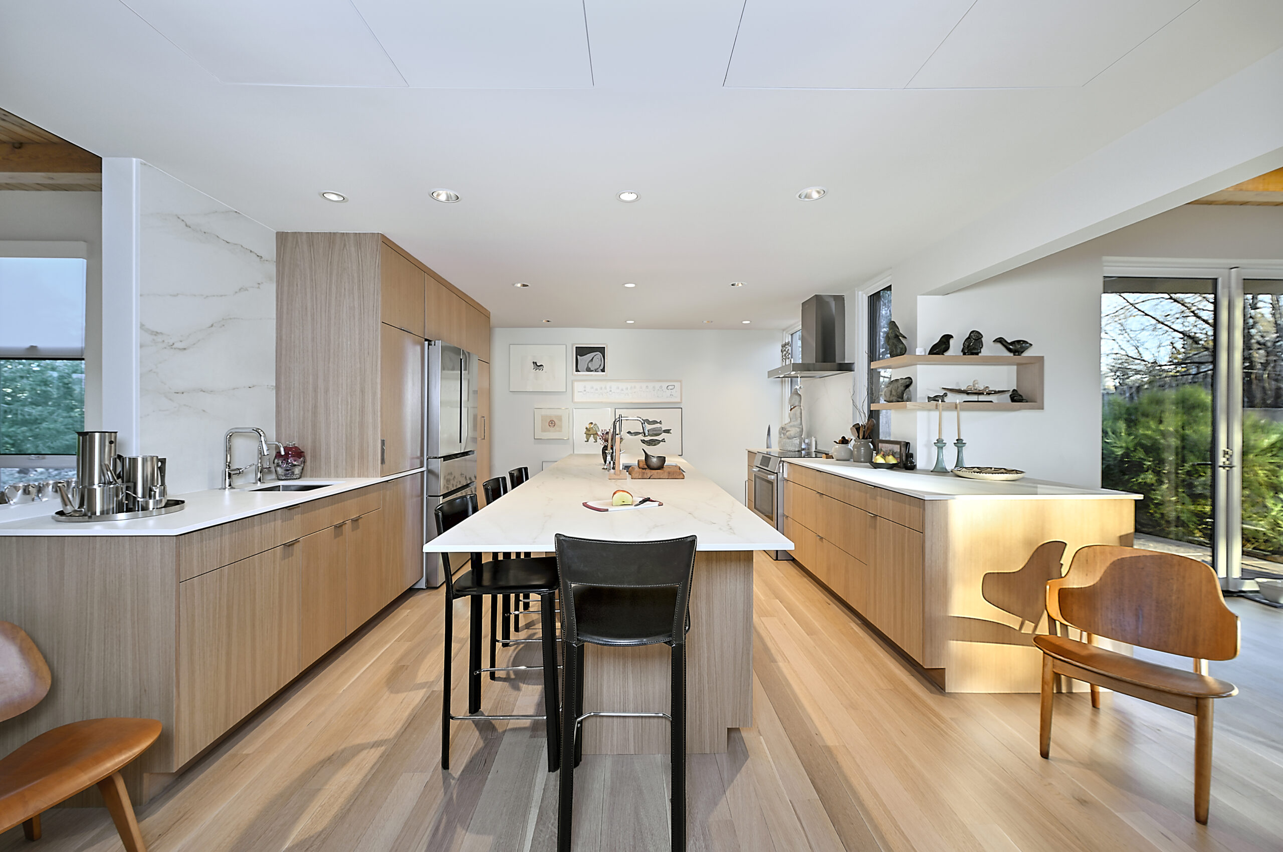 The remodeled kitchen features stainless steel appliances, oak cabinets by Sierra Woods Cabinets, and sleek white solid surface countertops by La Piedra Granite. At the center, a dramatic island with seating serves as both a functional workspace and an aesthetic anchor—truly forming the emotional heart of the home.