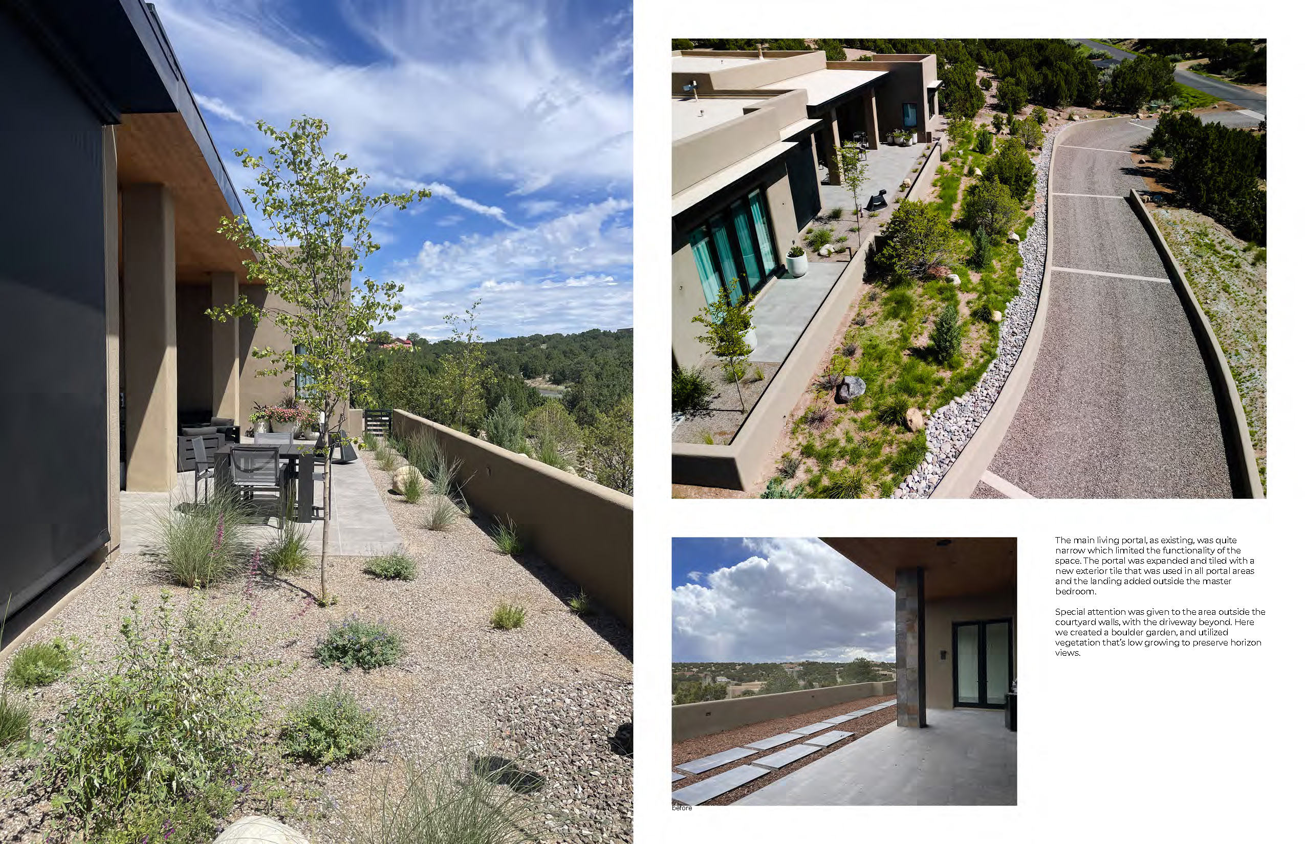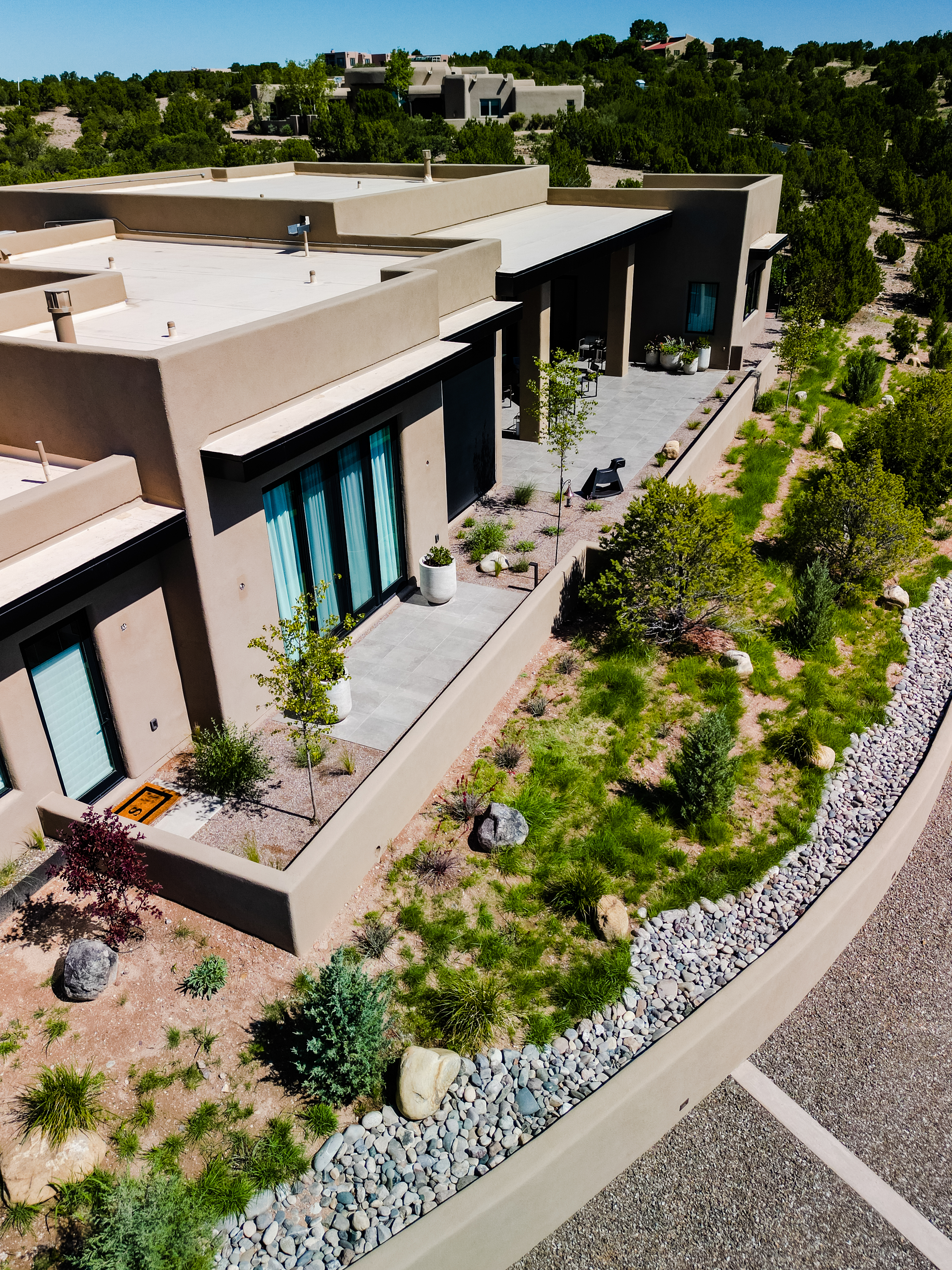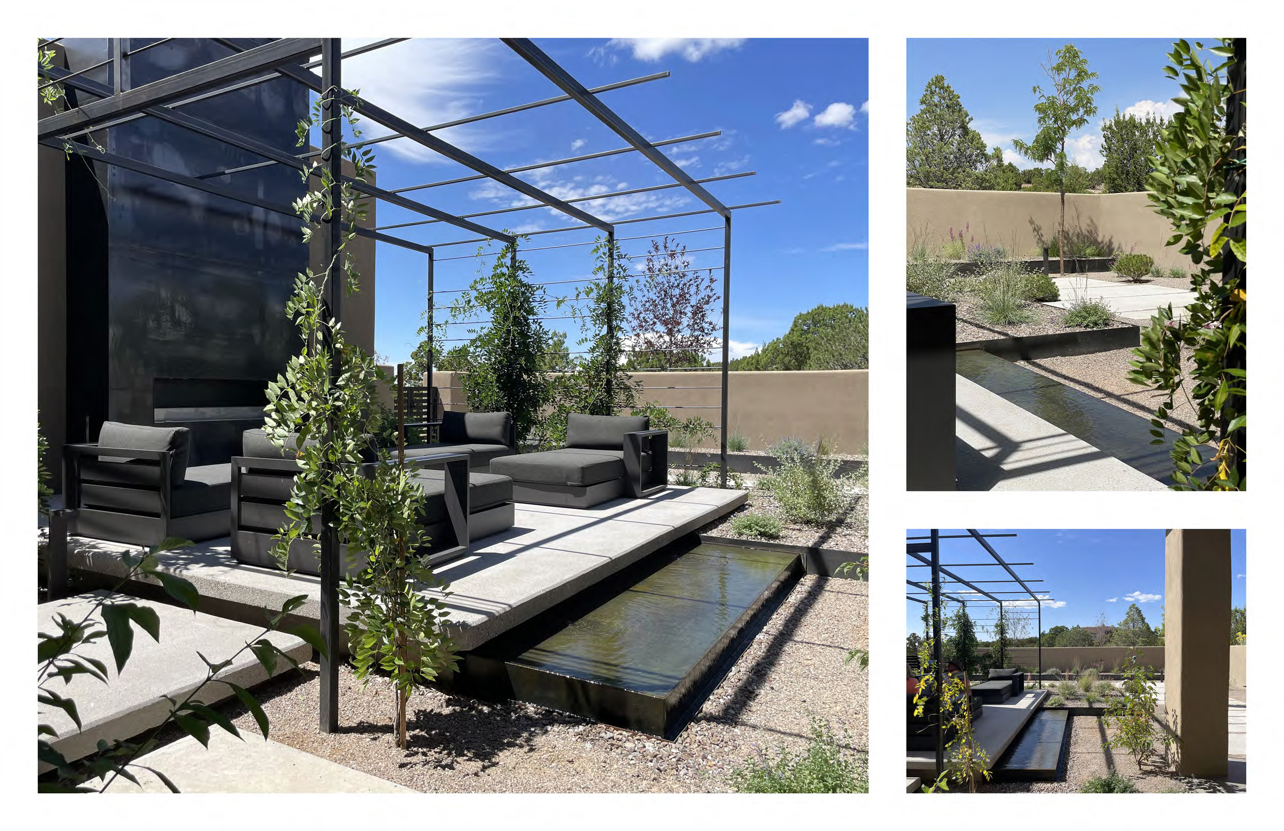 Homeowners tasked landscape architects Serquis + Associates with perfecting and completing the previously unfinished outdoor spaces of their new residence. Before the home purchase, these areas had been hastily completed without the necessary attention to detail. The landscape design team sought to integrate the exterior with the impeccably finished interior spaces, optimize the home’s orientation toward the breathtaking New Mexican landscape, and create a seamless indoor-outdoor living experience.