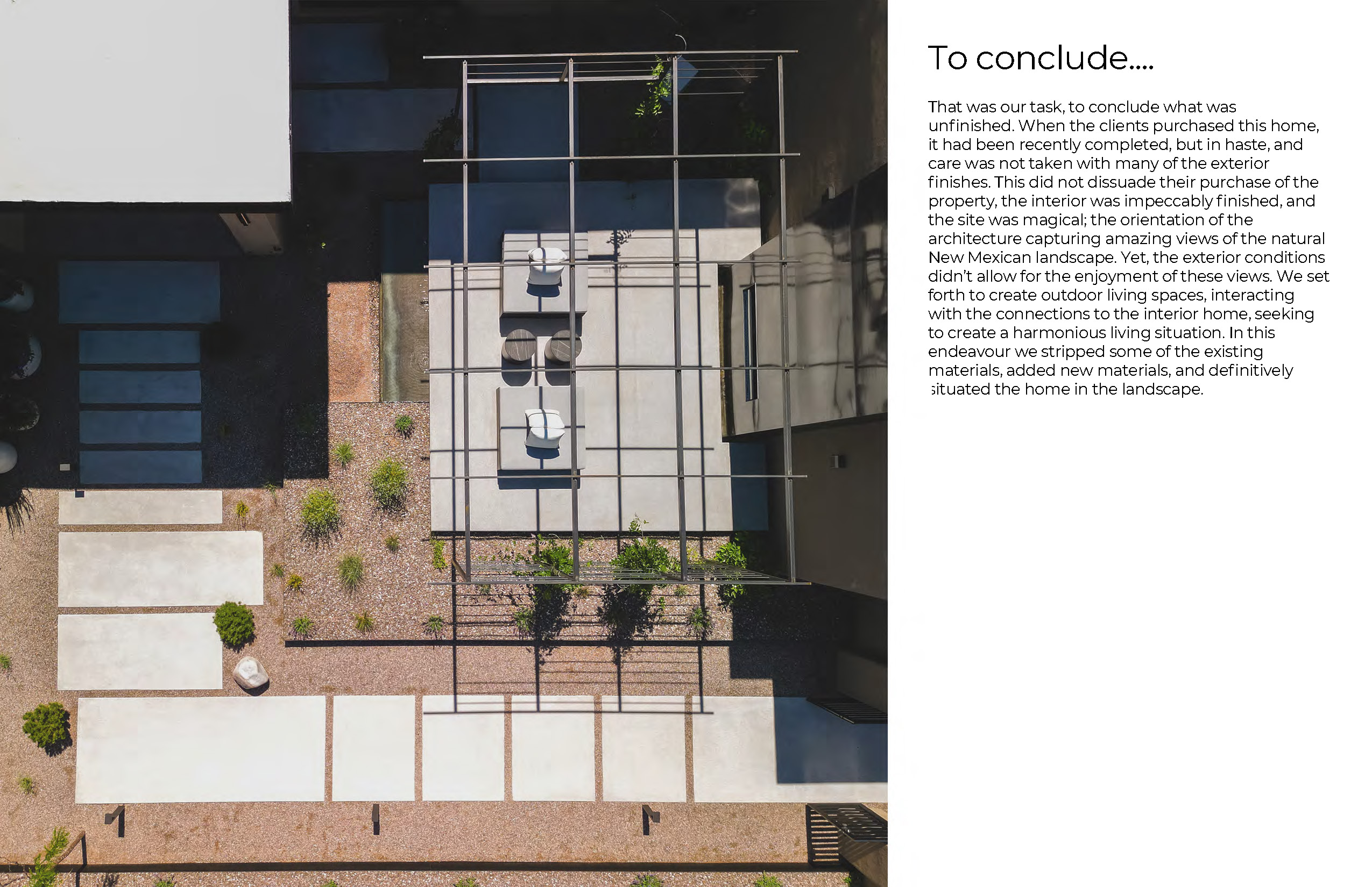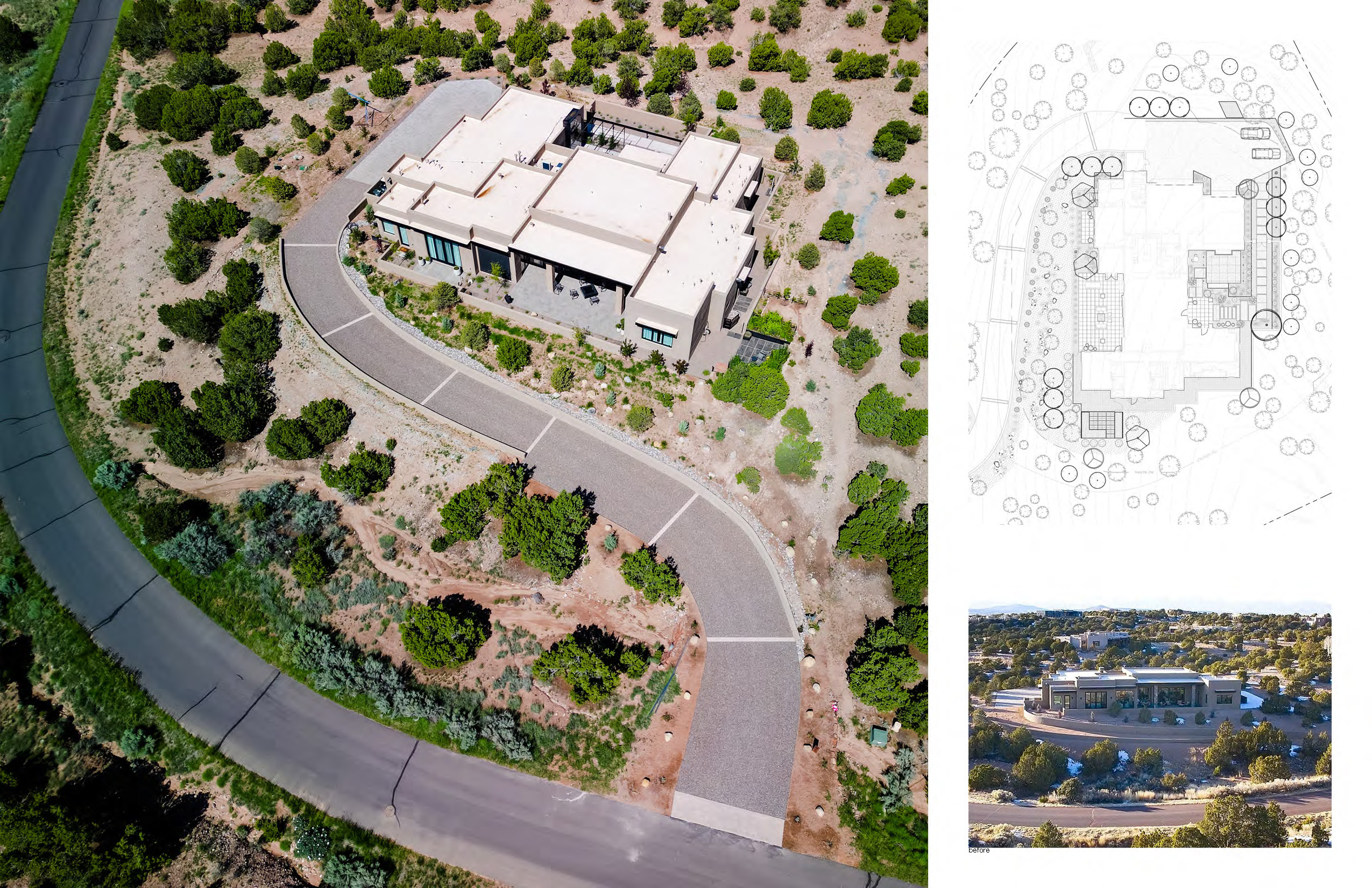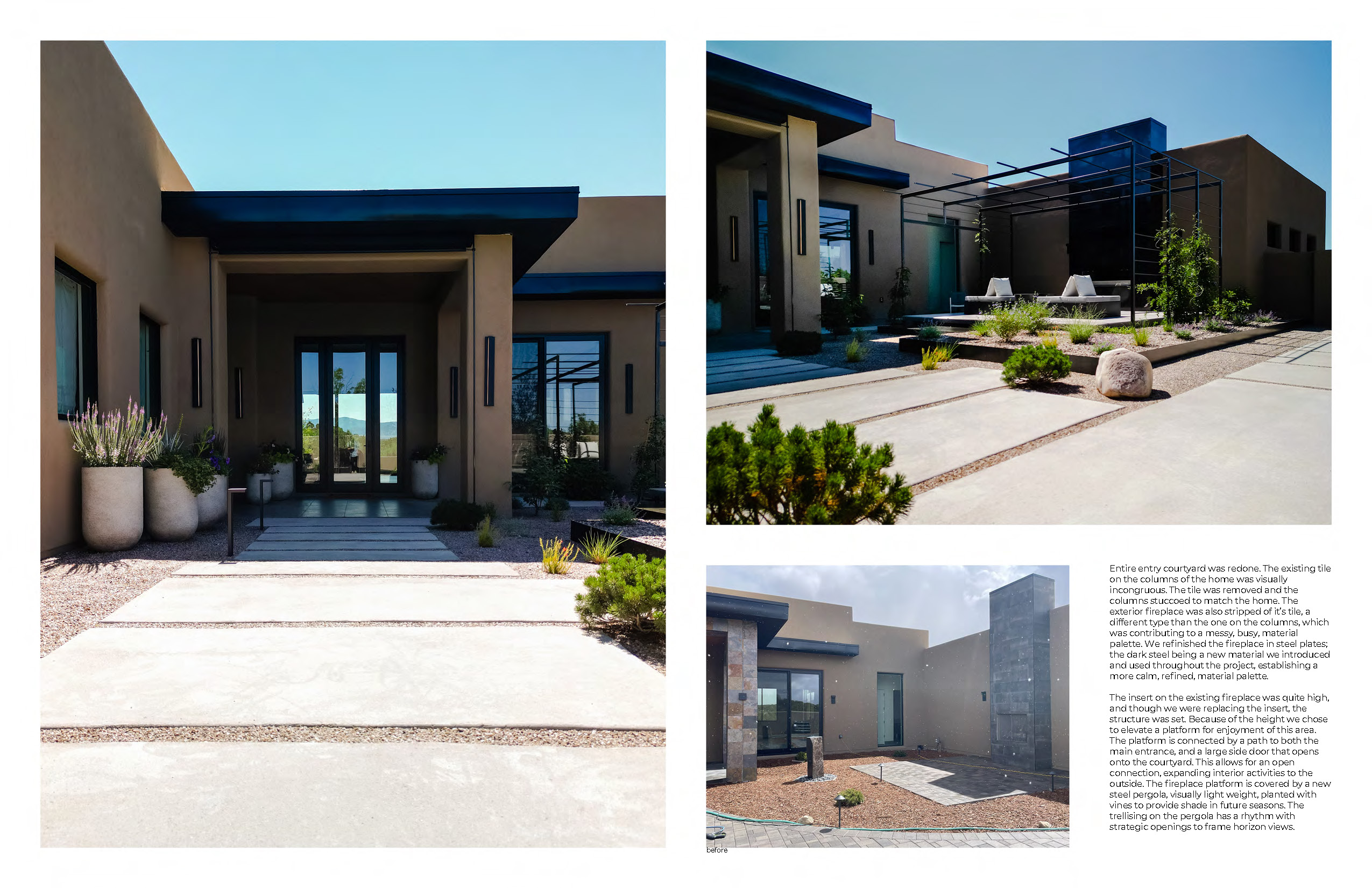 Homeowners tasked landscape architects Serquis + Associates with perfecting and completing the previously unfinished outdoor spaces of their new residence. Before the home purchase, these areas had been hastily completed without the necessary attention to detail. The landscape design team sought to integrate the exterior with the impeccably finished interior spaces, optimize the home’s orientation toward the breathtaking New Mexican landscape, and create a seamless indoor-outdoor living experience.
